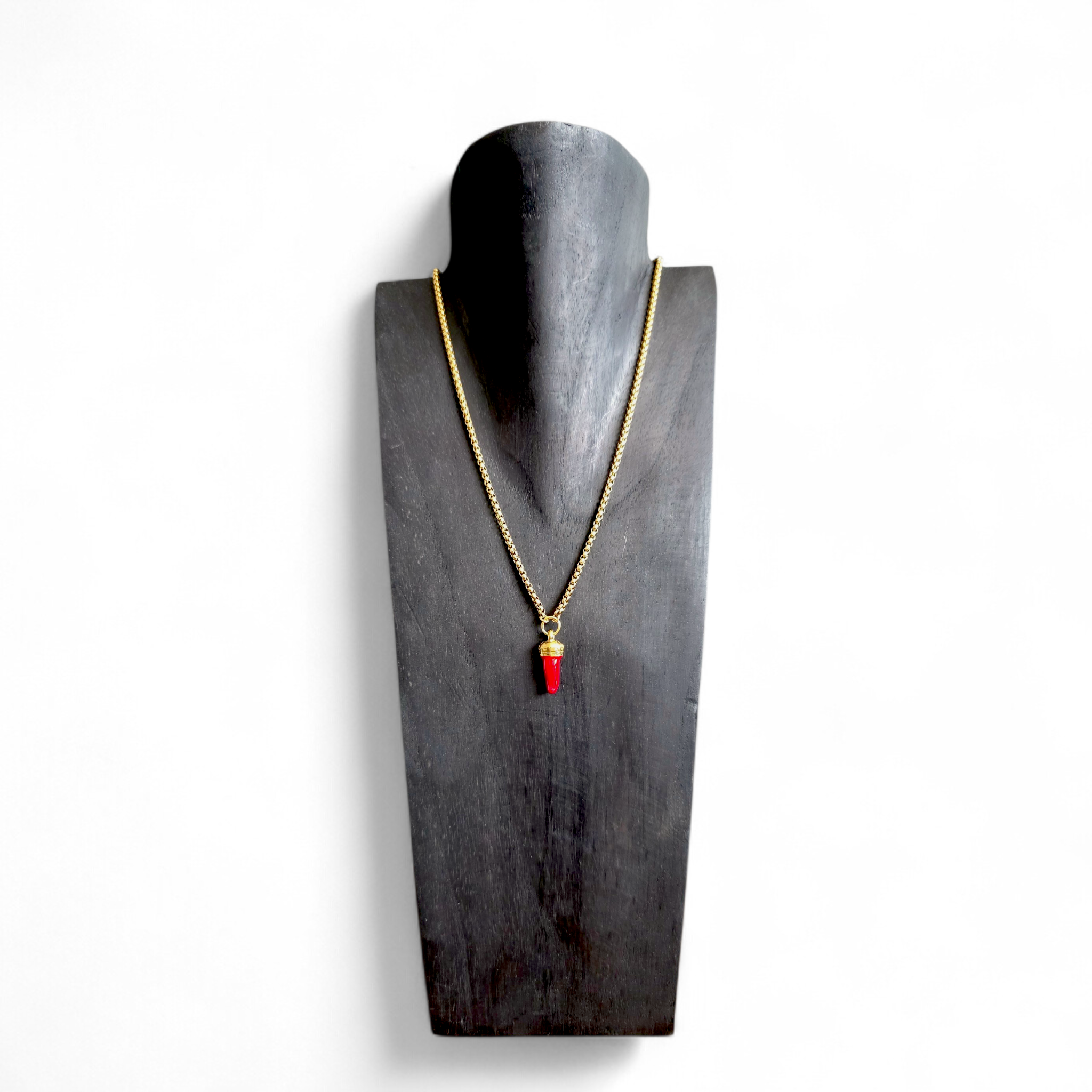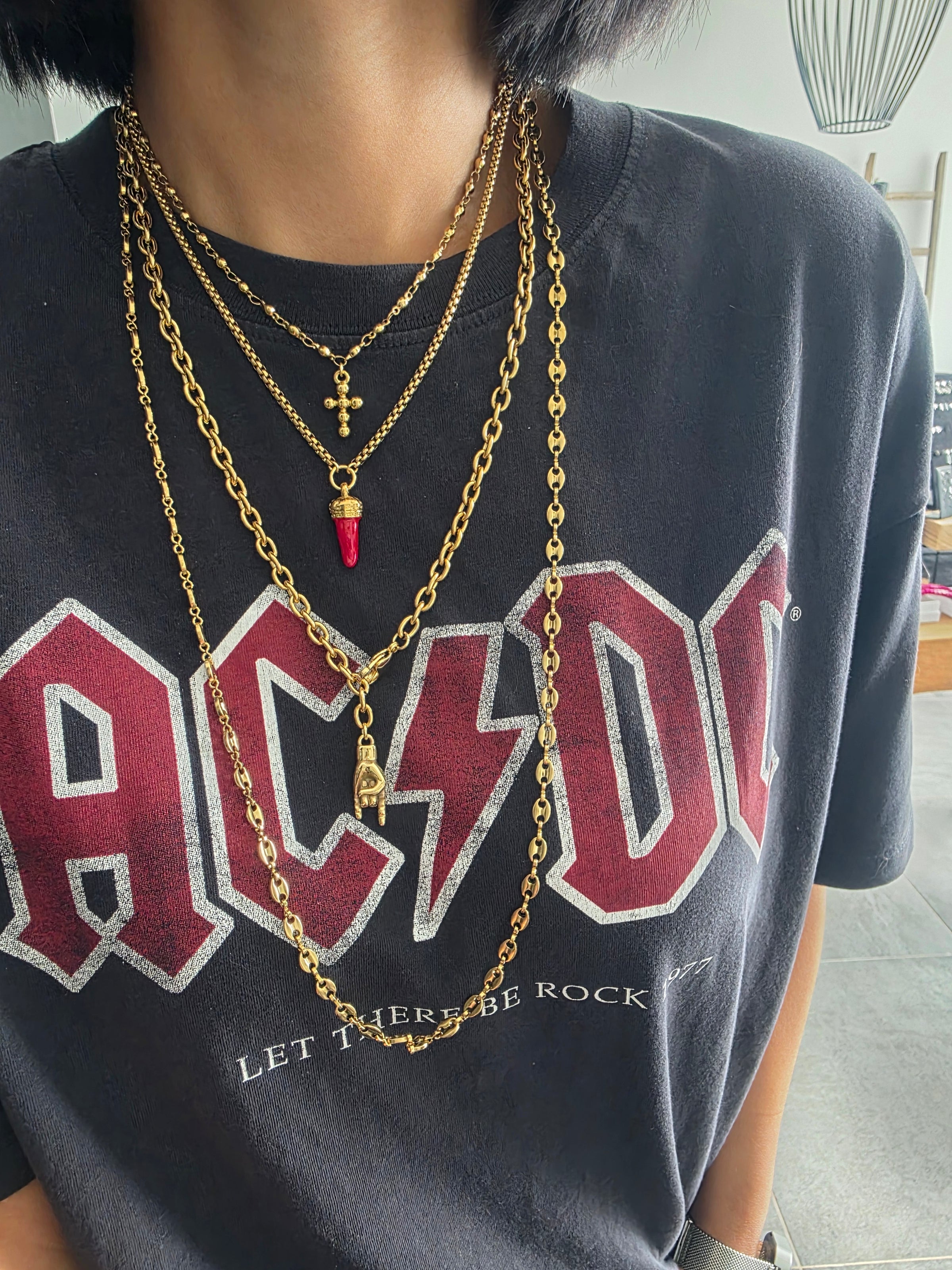 Collana in acciaio inox dorata con cornetto rosso.
